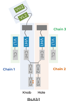 Challenge: BsAb1 different chains exhibit varying expression levels, leading to low yield and purity when transfected with an equal molar plasmid ratio.